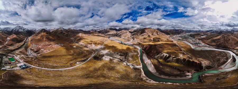 An aerial panoramic drone photo taken on Oct. 26, 2025 shows a view of the Lancang River in Zadoi County, northwest China’s Qinghai Province. (Xinhua/Du Xiaowei)