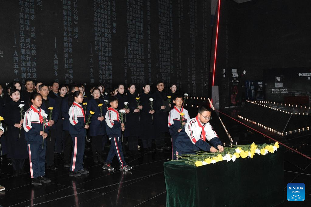 A memorial ceremony for the Nanjing Massacre victims is held at the Exhibition Hall of Evidence of Crimes Committed by Unit 731 of the Japanese Imperial Army in Harbin, capital of northeast China’s Heilongjiang Province, Dec. 13, 2025. The 12th national memorial day was observed on Saturday across the country to honor about 300,000 victims killed by Japanese troops during the Nanjing Massacre, in a year that marks the 80th anniversary of the end of World War II (WWII). (Photo by Liu Yang/Xinhua)