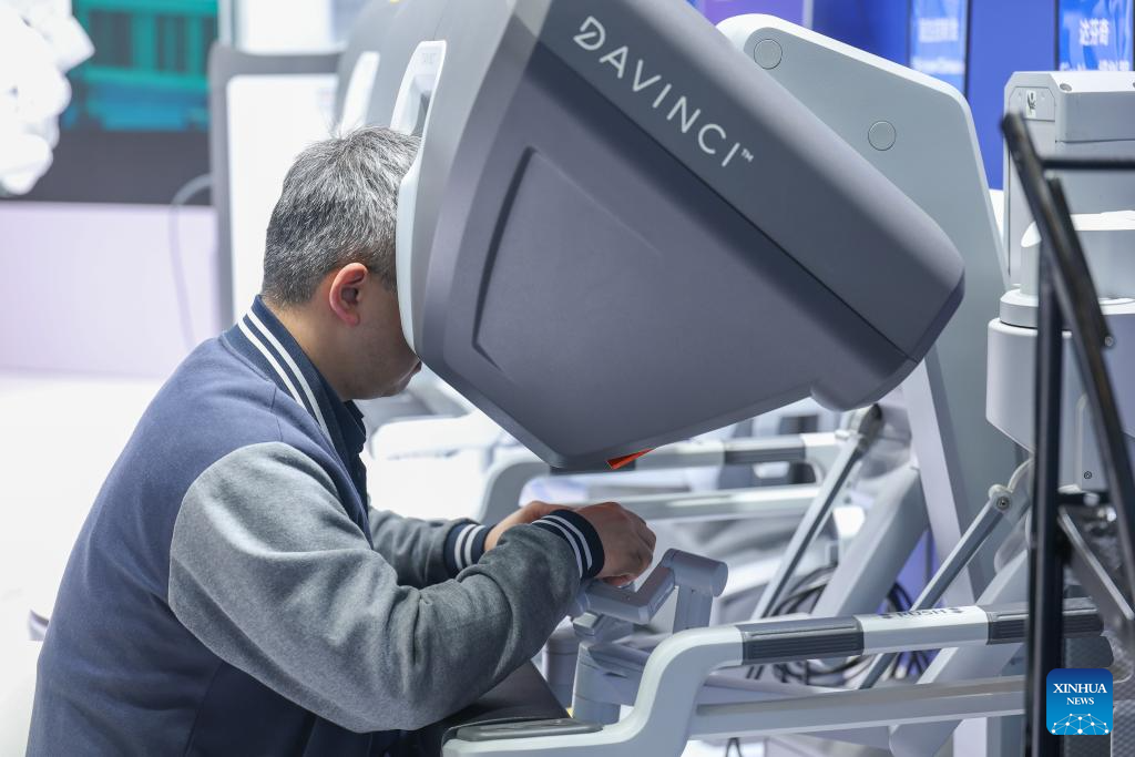 A visitor experiences a surgical robot system during the 2026 China Medical Equipment Conference & Medical Equipment Exhibition held at Chongqing International Expo Center in southwest China’s Chongqing Municipality, March 29, 2026. The four-day exhibition kicked off here on Thursday, with more than 800 companies participating and showcasing numerous innovative achievements and cutting-edge technologies in medical equipment. (Xinhua/Huang Wei)