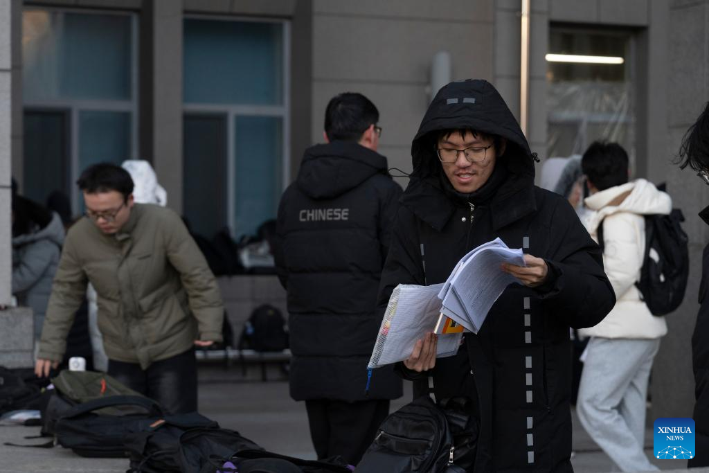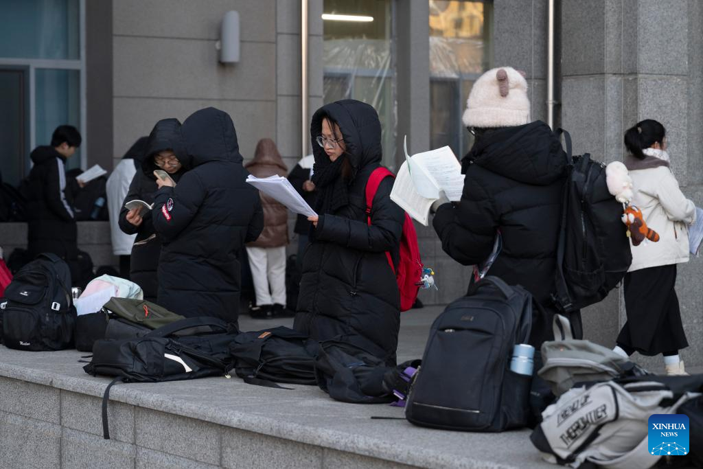 Examinees review their study materials outside an examination site for the 2026 postgraduate entrance exam in Harbin, northeast China’s Heilongjiang Province, Dec. 20, 2025. China’s national exam for postgraduate enrolment kicked off on Saturday. (Xinhua/Zhang Tao)