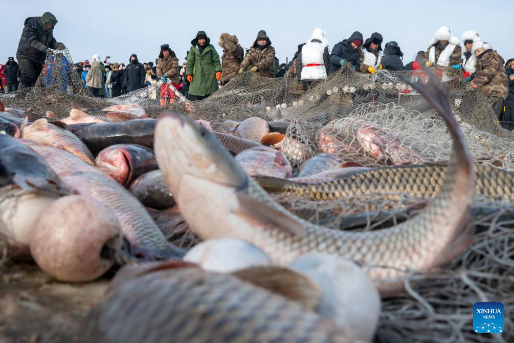 Fishermen haul a fishing net out of the frozen surface of the lake during the 2026 Xingkai Lake winter fishing festival at Xingkai Lake in northeast China’s Heilongjiang Province, Jan. 17, 2026. The festival was kicked off on Saturday on the shore of Xingkai Lake, a boundary lake between China and Russia, presenting a fully-integrated immersive experience in folk arts, sports and amusements for visitors. (Xinhua/Zhang Tao)