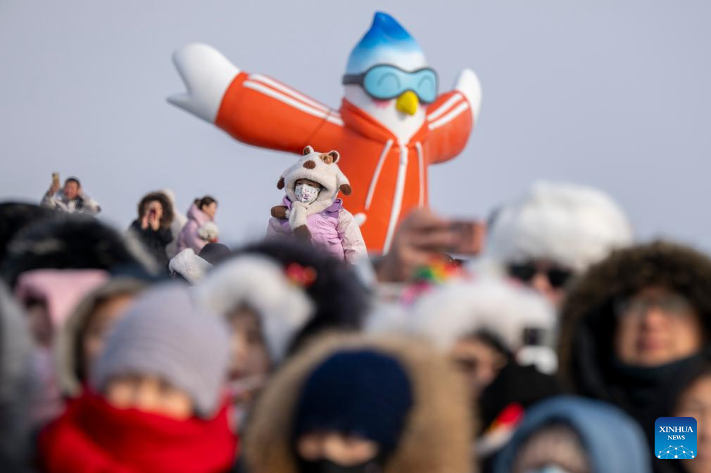 People watch performances during the 2026 Xingkai Lake winter fishing festival at Xingkai Lake in northeast China’s Heilongjiang Province, Jan. 17, 2026. The festival was kicked off on Saturday on the shore of Xingkai Lake, a boundary lake between China and Russia, presenting a fully-integrated immersive experience in folk arts, sports and amusements for visitors. (Xinhua/Zhang Tao)