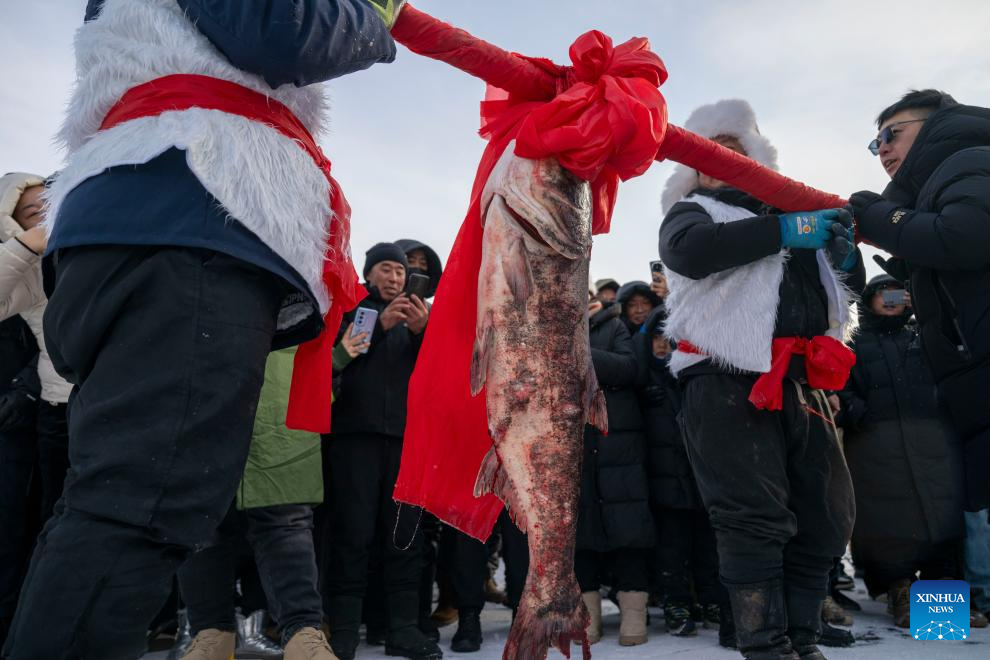Fishermen transfer the first fish caught during the 2026 Xingkai Lake winter fishing festival at Xingkai Lake in northeast China’s Heilongjiang Province, Jan. 17, 2026. The festival was kicked off on Saturday on the shore of Xingkai Lake, a boundary lake between China and Russia, presenting a fully-integrated immersive experience in folk arts, sports and amusements for visitors. (Xinhua/Zhang Tao)
