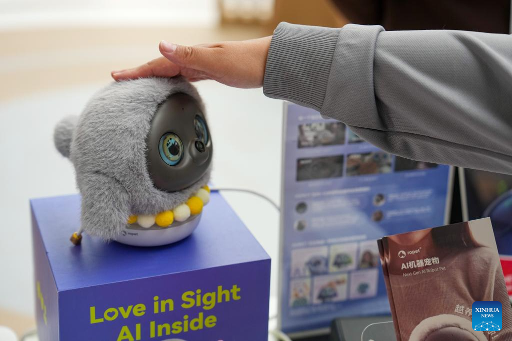 A visitor interacts with a robot pet at the Zhongguancun International Innovation Center in Beijing, capital of China, March 24, 2026. Themed “Full Integration Between Technological and Industrial Innovation,” this year’s Zhongguancun Forum will be held in Beijing from March 25 to 29. More than 1,000 guests from over 100 countries and regions are expected to participate in the forum, which features more than 100 events. (Xinhua/Ju Huanzong)
