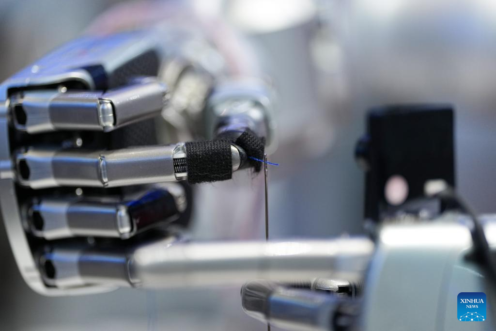 A robot displays threading at the Zhongguancun Exhibition Center in Beijing, capital of China, March 24, 2026. Themed “Full Integration Between Technological and Industrial Innovation,” this year’s Zhongguancun Forum will be held in Beijing from March 25 to 29. More than 1,000 guests from over 100 countries and regions are expected to participate in the forum, which features more than 100 events. (Xinhua/Ju Huanzong)