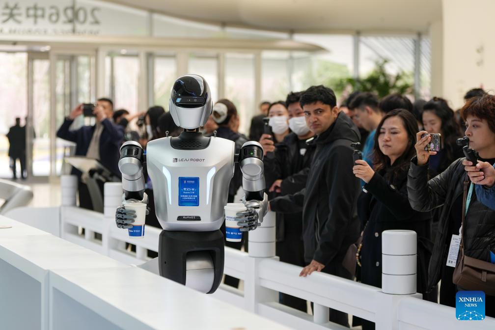 A humanoid robot serves drinks at the Zhongguancun International Innovation Center in Beijing, capital of China, March 24, 2026. Themed “Full Integration Between Technological and Industrial Innovation,” this year’s Zhongguancun Forum will be held in Beijing from March 25 to 29. More than 1,000 guests from over 100 countries and regions are expected to participate in the forum, which features more than 100 events. (Xinhua/Ju Huanzong)