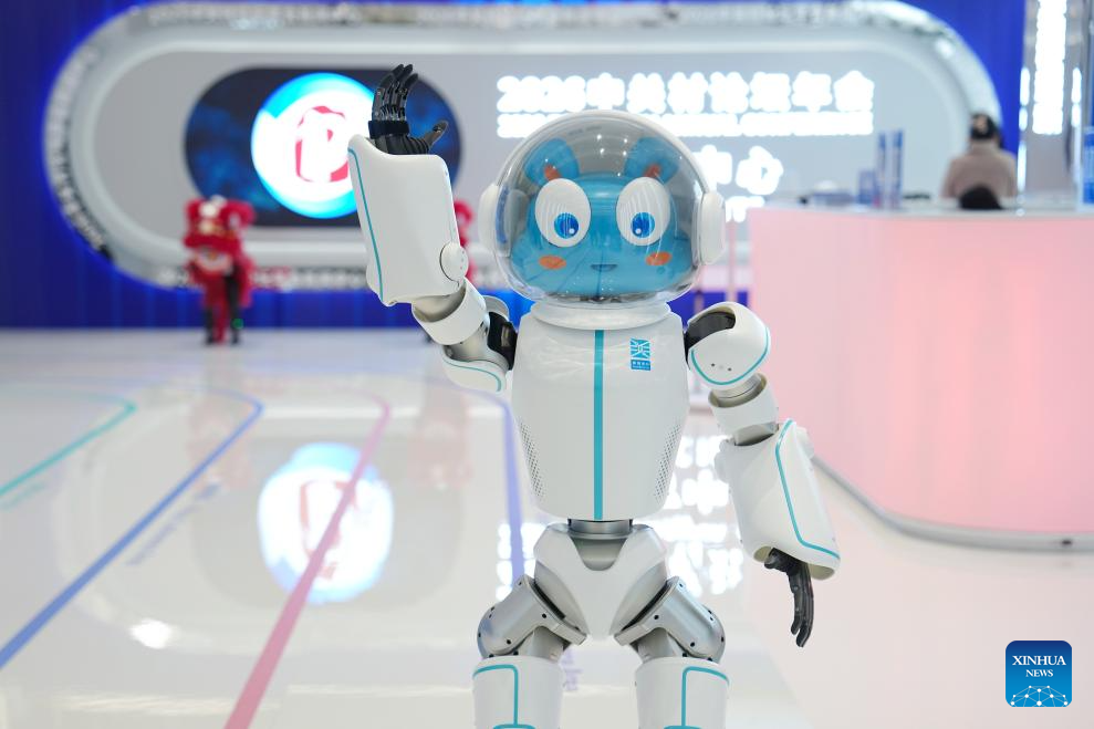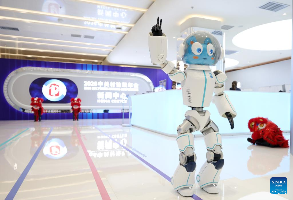 A robot waves to the audience at the media center of the 2026 Zhongguancun Forum (ZGC Forum) in Beijing, capital of China, March 24, 2026. Themed “Full Integration Between Technological and Industrial Innovation,” this year’s ZGC Forum will be held in Beijing from March 25 to 29. More than 1,000 guests from over 100 countries and regions are expected to participate in the forum, which features more than 100 events. (Xinhua/Zhang Chenlin)