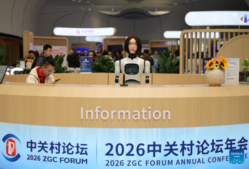 A humanoid robot (1st R) makes self-introduction at an information desk of the Zhongguancun International Innovation Center in Beijing, capital of China, March 24, 2026. Themed “Full Integration Between Technological and Industrial Innovation,” this year’s Zhongguancun Forum will be held in Beijing from March 25 to 29. More than 1,000 guests from over 100 countries and regions are expected to participate in the forum, which features more than 100 events. (Xinhua/Ju Huanzong)