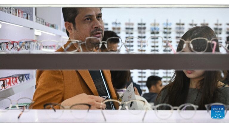 A foreign purchaser communicates with an exhibitor at a booth of glasses during the 138th edition of the China Import and Export Fair (Canton Fair) in Guangzhou, south China’s Guangdong Province, Oct. 23, 2025. The second phase of the 138th edition of the Canton Fair kicked off here on Thursday, showcasing quality household goods, gifts, decorations, building materials, and furniture.