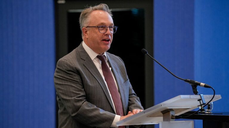 John Williams, president and chief executive officer of the Federal Reserve Bank of New York, during a farewell symposium for former De Nederlandsche Bank NV President Klaas Knot at the central bank headquarters in Amsterdam, Netherlands, on Friday, Oct. 3, 2025.