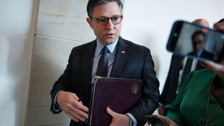 Speaker of the House Mike Johnson, R-La., talks with reporters in the Capitol Visitor Center after a meeting of the House Republican Conference on Tuesday, February 10, 2026.