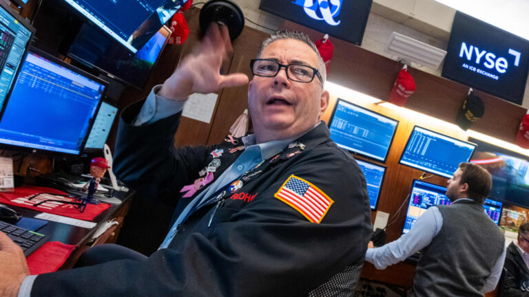 Traders work on the floor of the New York Stock Exchange (NYSE) on October 17, 2025 in New York City.