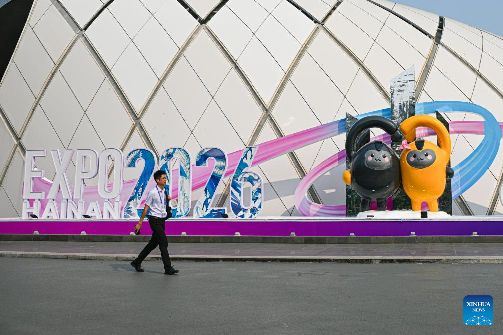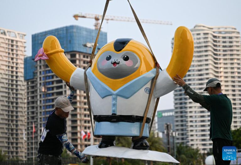 Workers hoist a mascot of the sixth China International Consumer Products Expo (CICPE) at the Hainan International Convention and Exhibition Center, the main venue for the upcoming sixth CICPE, in Haikou, south China’s Hainan Province, April 10, 2026. Scheduled to take place in south China’s Hainan Province from April 13 to 18, this expo will see the participation of more than 3,400 brands from over 60 countries and regions. (Xinhua/Pu Xiaoxu)