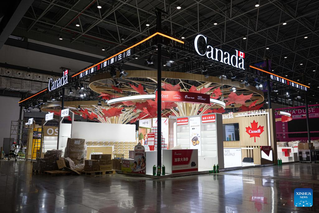 This photo taken on April 10, 2026 shows a view of the national pavilion of Canada, guest of honor of the sixth China International Consumer Products Expo (CICPE), at the Hainan International Convention and Exhibition Center, the main venue for the upcoming sixth CICPE, in Haikou, south China’s Hainan Province. Scheduled to take place in south China’s Hainan Province from April 13 to 18, this expo will see the participation of more than 3,400 brands from over 60 countries and regions. (Xinhua/Pu Xiaoxu)