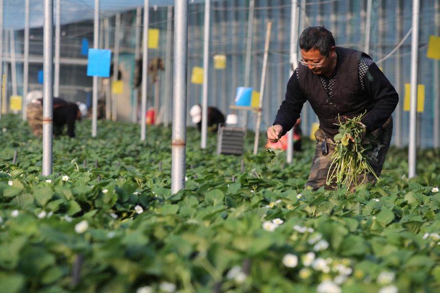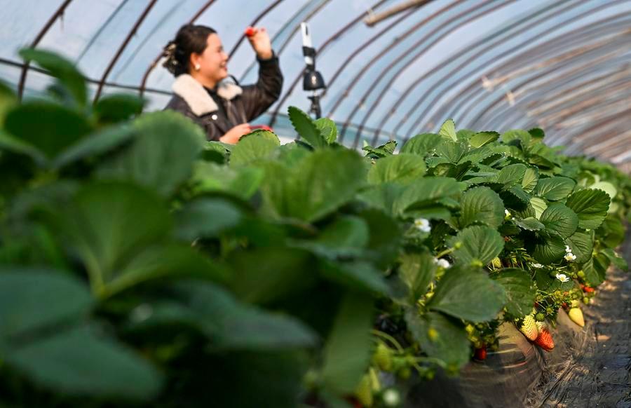 Staff members check the growth of strawberries in Weihai City, east China’s Shandong Province, Dec. 6, 2025. (Photo by Chen Hongqing/Xinhua)