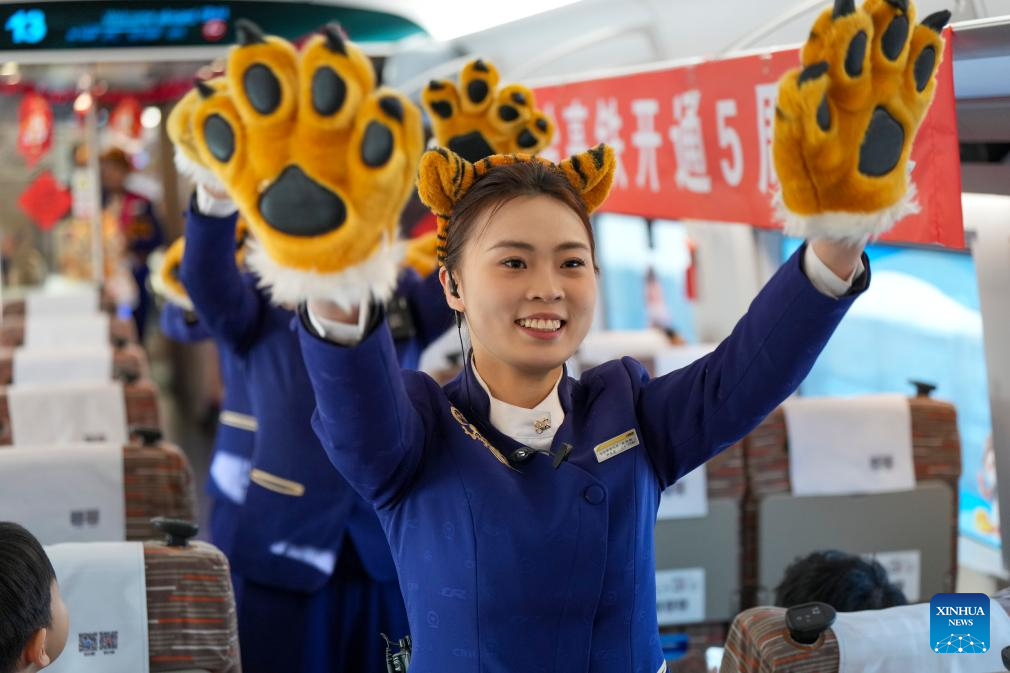 A train attendant displays Siberian Tiger figurines on bullet train G902 from Harbin, northeast China’s Heilongjiang Province, to Beijing, capital of China, on Jan. 22, 2026. The Beijing-Harbin high-speed railway marked the 5th anniversary of its full operation on Thursday. At 1,198 kilometers, the rail line links China’s northeastern provinces of Liaoning, Jilin and Heilongjiang with the capital Beijing. (Xinhua/Wang Song)