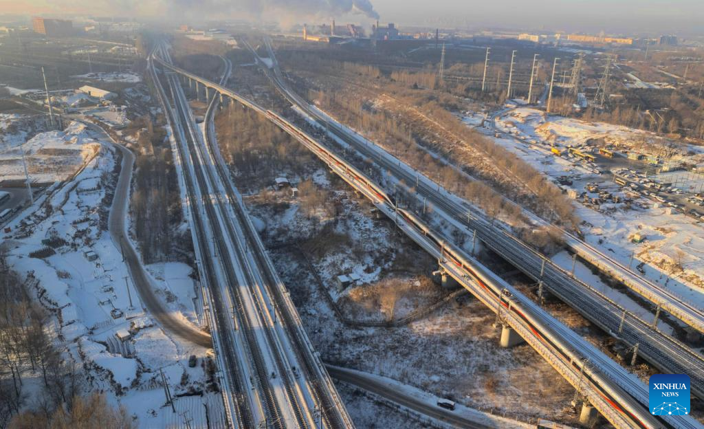 An aerial drone photo taken on Jan. 22, 2026 shows a view of train No. G902 from Harbin, northeast China’s Heilongjiang Province, to Beijing, capital of China. The Beijing-Harbin high-speed railway marked the 5th anniversary of its full operation on Thursday. At 1,198 kilometers, the rail line links China’s northeastern provinces of Liaoning, Jilin and Heilongjiang with the capital Beijing. (Photo by Xu Shuai/Xinhua)