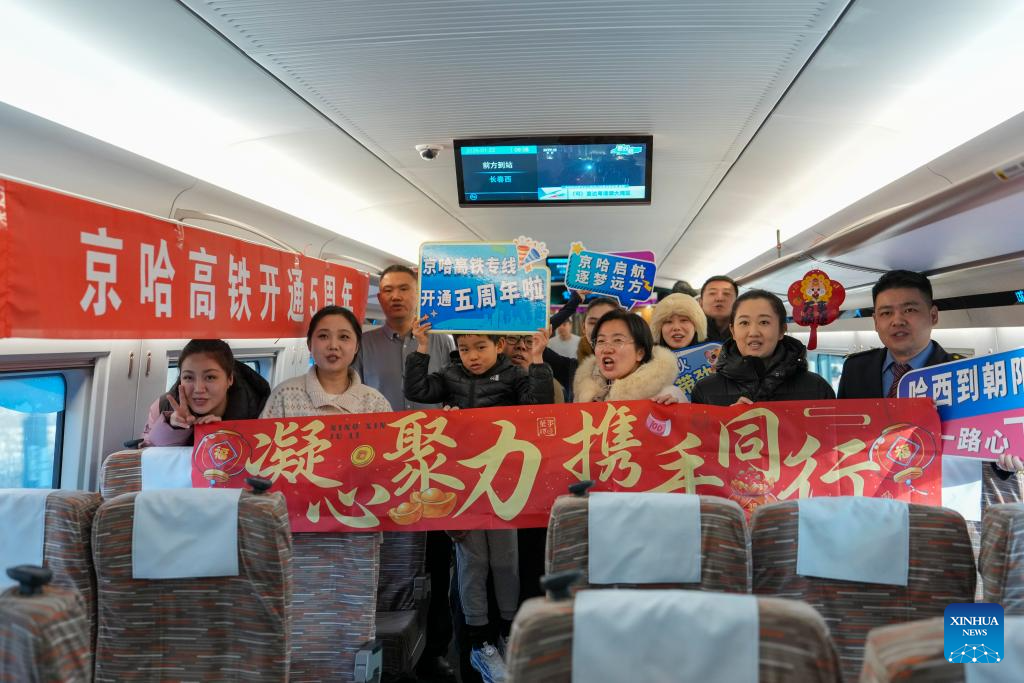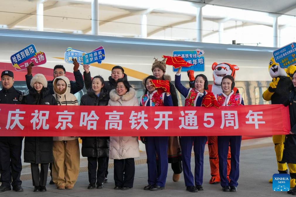 Train attendants pose for a group photo with passengers at the Harbin West Railway Station in Harbin, northeast China’s Heilongjiang Province, on Jan. 22, 2026. The Beijing-Harbin high-speed railway marked the 5th anniversary of its full operation on Thursday. At 1,198 kilometers, the rail line links China’s northeastern provinces of Liaoning, Jilin and Heilongjiang with the capital Beijing. (Xinhua/Wang Song)
