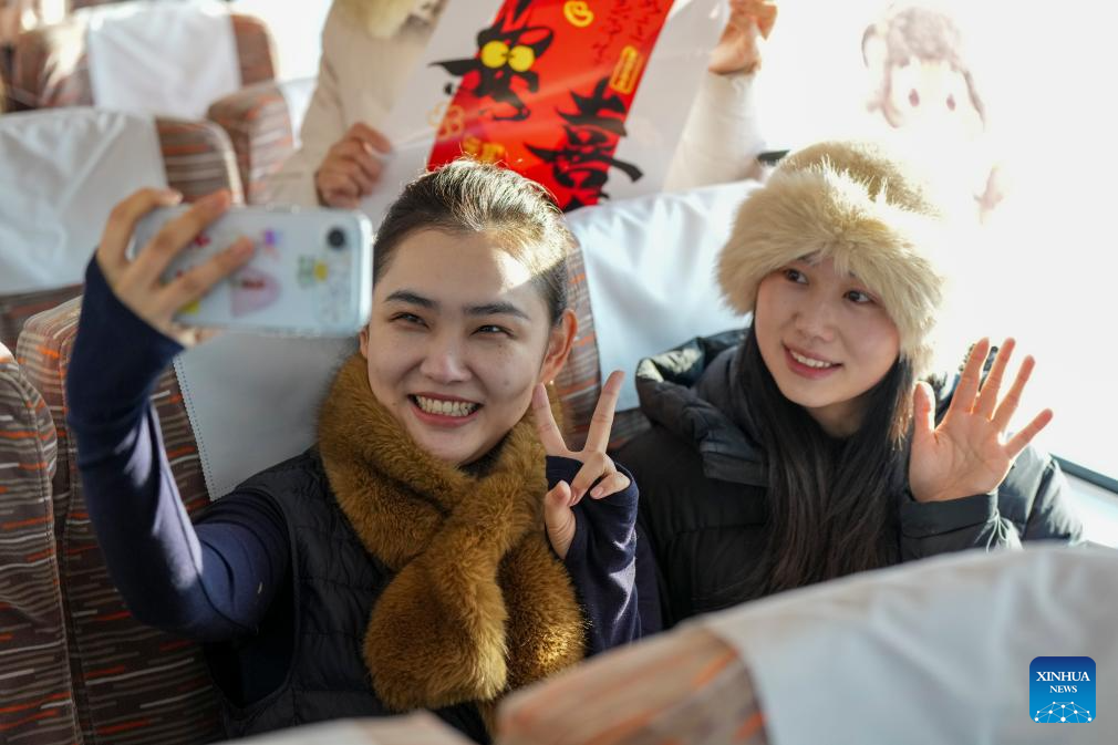 Passengers take a selfie on bullet train G902 from Harbin, northeast China’s Heilongjiang Province, to Beijing, capital of China, on Jan. 22, 2026. The Beijing-Harbin high-speed railway marked the 5th anniversary of its full operation on Thursday. At 1,198 kilometers, the rail line links China’s northeastern provinces of Liaoning, Jilin and Heilongjiang with the capital Beijing. (Xinhua/Wang Song)