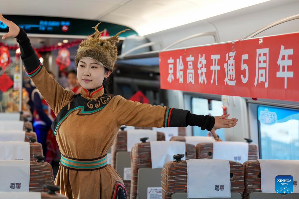 A train attendant performs on bullet train G902 from Harbin, northeast China’s Heilongjiang Province, to Beijing, capital of China, on Jan. 22, 2026. The Beijing-Harbin high-speed railway marked the 5th anniversary of its full operation on Thursday. At 1,198 kilometers, the rail line links China’s northeastern provinces of Liaoning, Jilin and Heilongjiang with the capital Beijing. (Xinhua/Wang Song)