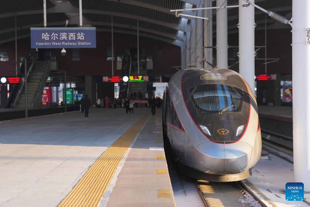 Passengers prepare to board the bullet train G902 at the Harbin West Railway Station in Harbin, northeast China’s Heilongjiang Province, on Jan. 22, 2026. The Beijing-Harbin high-speed railway marked the 5th anniversary of its full operation on Thursday. At 1,198 kilometers, the rail line links China’s northeastern provinces of Liaoning, Jilin and Heilongjiang with the capital Beijing. (Xinhua/Wang Song)