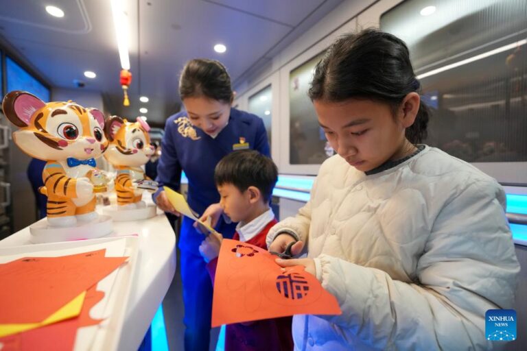 Children experience paper-cutting on bullet train G902 from Harbin, northeast China’s Heilongjiang Province, to Beijing, capital of China, on Jan. 22, 2026. The Beijing-Harbin high-speed railway marked the 5th anniversary of its full operation on Thursday. At 1,198 kilometers, the rail line links China’s northeastern provinces of Liaoning, Jilin and Heilongjiang with the capital Beijing. (Xinhua/Wang Song)