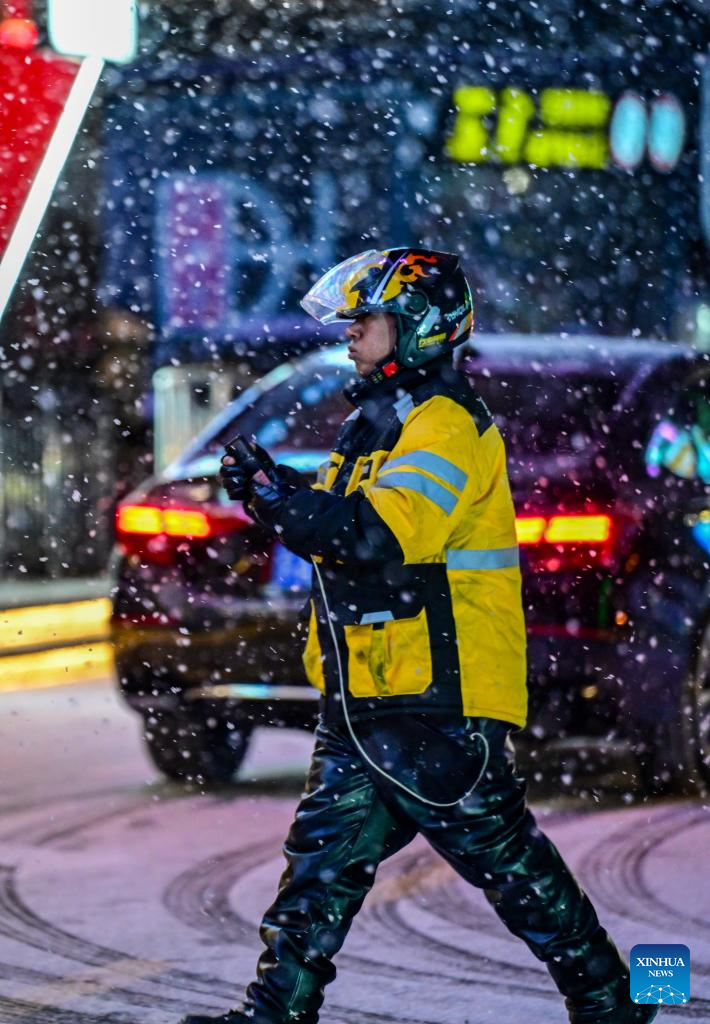 A deliveryman works amidst snowfall in Beijing, capital of China, on Jan. 17, 2026. Beijing witnessed a snowfall on Friday. (Xinhua/Chen Yehua)