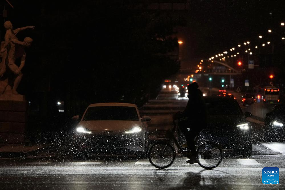 A cyclist rides amidst snowfall in Beijing, capital of China, on Jan. 17, 2026. Beijing witnessed a snowfall on Friday. (Xinhua/Ju Huanzong)
