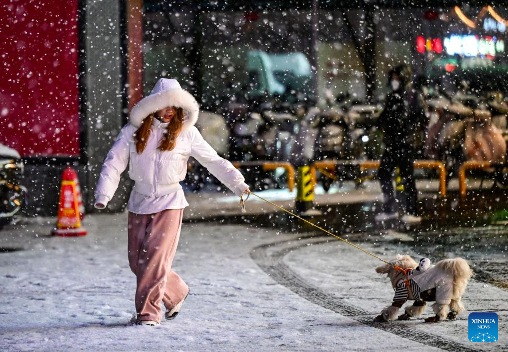 A citizen walks a dog amidst snowfall in Beijing, capital of China, on Jan. 17, 2026. Beijing witnessed a snowfall on Friday. (Xinhua/Chen Yehua)