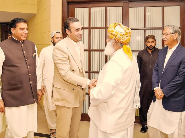Earlier in the day, a PPP delegation led by Chairman Bilawal Bhutto Zardari – and comprising former prime minister Raja Pervez Ashraf, Nayyar Hussain Bukhari, and PPP Kashmir President Chaudhry Yasin – arrived at Maulana Fazlur Rehman’s residence. The JUI-F chief was accompanied by his son, Maulana Asadur Rehman.