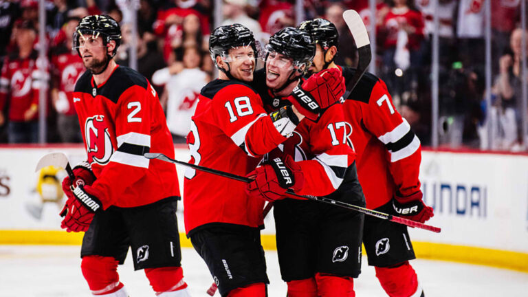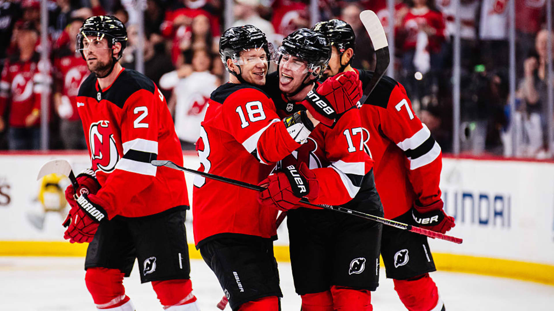 The New Jersey Devils celebrate after Simon Nemec #17 scores the game-winning-goal in double overtime of Game Three of the First Round of the 2025 Stanley Cup Playoffs against the Carolina Hurricanes at Prudential Center on April 25, 2025 in Newark, New Jersey.