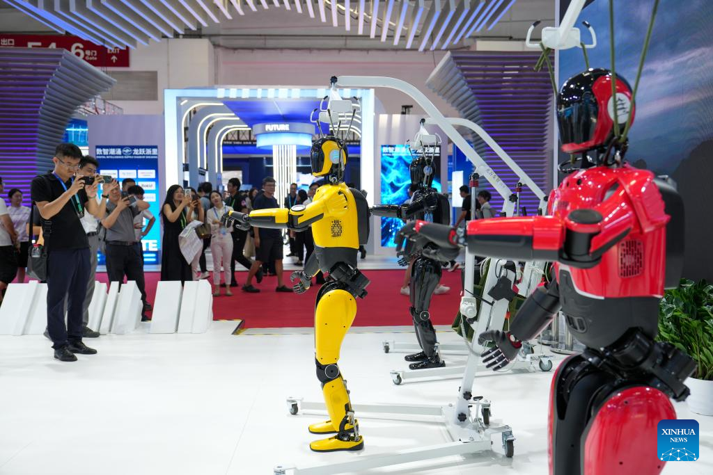 Visitors watch a humanoid robot performance in the Digital Technology Chain area of the third China International Supply Chain Expo (CISCE) in Beijing, capital of China, July 17, 2025. Held from July 16 to 20, the 2025 CISCE kicked off in Beijing on Wednesday. A key innovation for this edition is the “Debut Zone,” dedicated to the global premieres of new products, technologies, and ecosystems, showcasing breakthrough innovations that drive industrial collaboration. (Xinhua/Ju Huanzong)