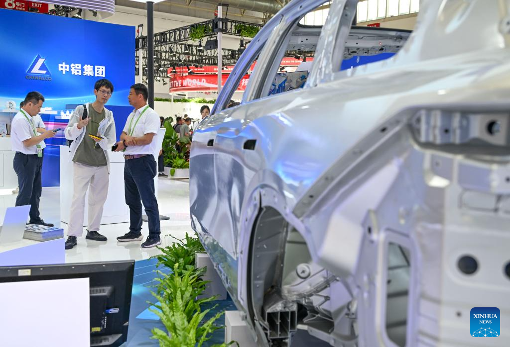 A visitor learns about aluminum materials for car body at the booth of Aluminum Corporation of China (Chinalco) in the Advanced Manufacturing Chain area of the third China International Supply Chain Expo (CISCE) in Beijing, capital of China, July 16, 2025. Held from July 16 to 20, the 2025 CISCE kicked off in Beijing on Wednesday. A key innovation for this edition is the “Debut Zone,” dedicated to the global premieres of new products, technologies, and ecosystems, showcasing breakthrough innovations that drive industrial collaboration. (Xinhua/Chen Shuo)