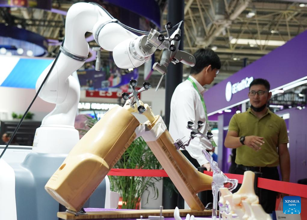 An AI-powered orthopedic surgical robot is seen in the Healthy Life Chain area of the third China International Supply Chain Expo (CISCE) in Beijing, capital of China, July 17, 2025. Held from July 16 to 20, the 2025 CISCE kicked off in Beijing on Wednesday. A key innovation for this edition is the “Debut Zone,” dedicated to the global premieres of new products, technologies, and ecosystems, showcasing breakthrough innovations that drive industrial collaboration. (Xinhua/Zhang Chenlin)