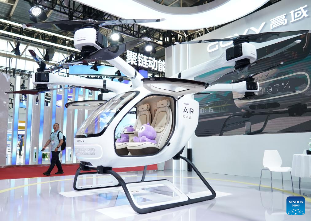 A low-altitude aircraft is seen at the booth of the tech company GOVY in the Smart Vehicle Chain area of the third China International Supply Chain Expo (CISCE) in Beijing, capital of China, July 17, 2025. Held from July 16 to 20, the 2025 CISCE kicked off in Beijing on Wednesday. A key innovation for this edition is the “Debut Zone,” dedicated to the global premieres of new products, technologies, and ecosystems, showcasing breakthrough innovations that drive industrial collaboration. (Xinhua/Zhang Chenlin)