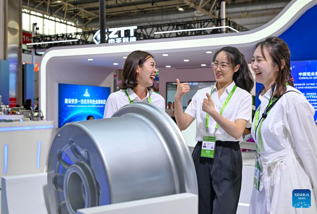 Exhibitors learn about an aluminum hub at the booth of Aluminum Corporation of China (Chinalco) in the Advanced Manufacturing Chain area of the third China International Supply Chain Expo (CISCE) in Beijing, capital of China, July 16, 2025. Held from July 16 to 20, the 2025 CISCE kicked off in Beijing on Wednesday. A key innovation for this edition is the “Debut Zone,” dedicated to the global premieres of new products, technologies, and ecosystems, showcasing breakthrough innovations that drive industrial collaboration. (Xinhua/Chen Shuo)