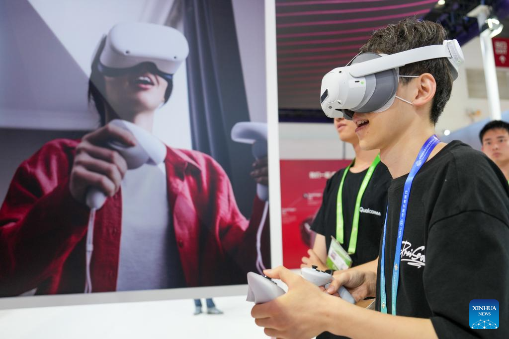 A visitor tries a product at the booth of Qualcomm in the Digital Technology Chain area of the third China International Supply Chain Expo (CISCE) in Beijing, capital of China, July 17, 2025. Held from July 16 to 20, the 2025 CISCE kicked off in Beijing on Wednesday. A key innovation for this edition is the “Debut Zone,” dedicated to the global premieres of new products, technologies, and ecosystems, showcasing breakthrough innovations that drive industrial collaboration. (Xinhua/Ju Huanzong)