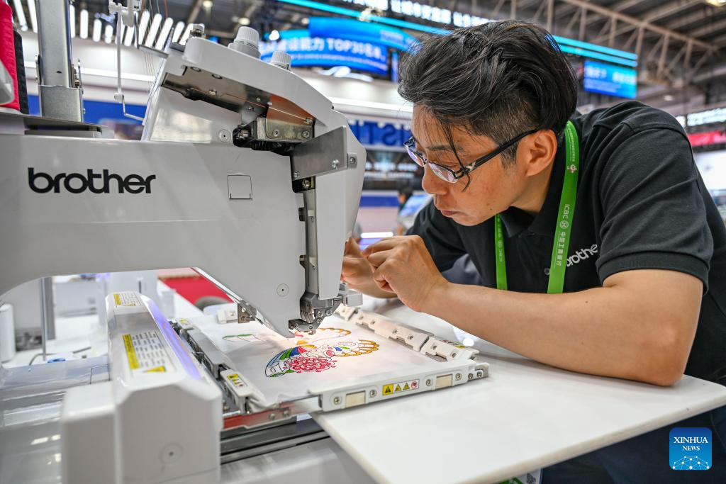 A staff member adjusts a commercial embroidery machine at the booth of Brother (China) in the Advanced Manufacturing Chain area of the third China International Supply Chain Expo (CISCE) in Beijing, capital of China, July 16, 2025. Held from July 16 to 20, the 2025 CISCE kicked off in Beijing on Wednesday. A key innovation for this edition is the “Debut Zone,” dedicated to the global premieres of new products, technologies, and ecosystems, showcasing breakthrough innovations that drive industrial collaboration. (Xinhua/Chen Shuo)