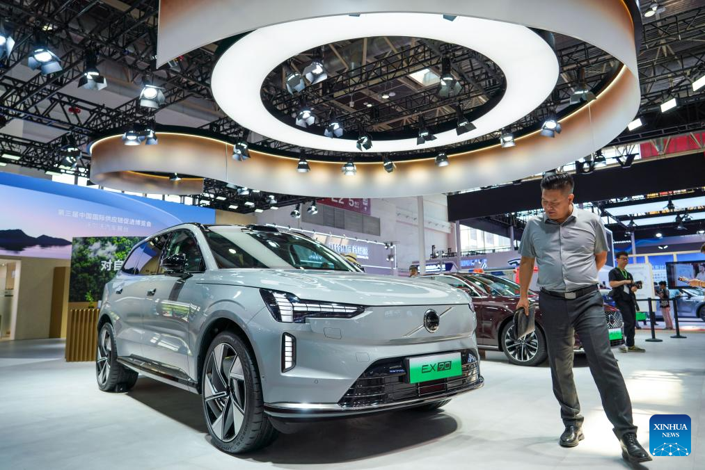 A visitor learns about a vehicle at the booth of Volvo in the Smart Vehicle Chain area of the third China International Supply Chain Expo (CISCE) in Beijing, capital of China, July 17, 2025. Held from July 16 to 20, the 2025 CISCE kicked off in Beijing on Wednesday. A key innovation for this edition is the “Debut Zone,” dedicated to the global premieres of new products, technologies, and ecosystems, showcasing breakthrough innovations that drive industrial collaboration. (Xinhua/Wang Jingyi)
