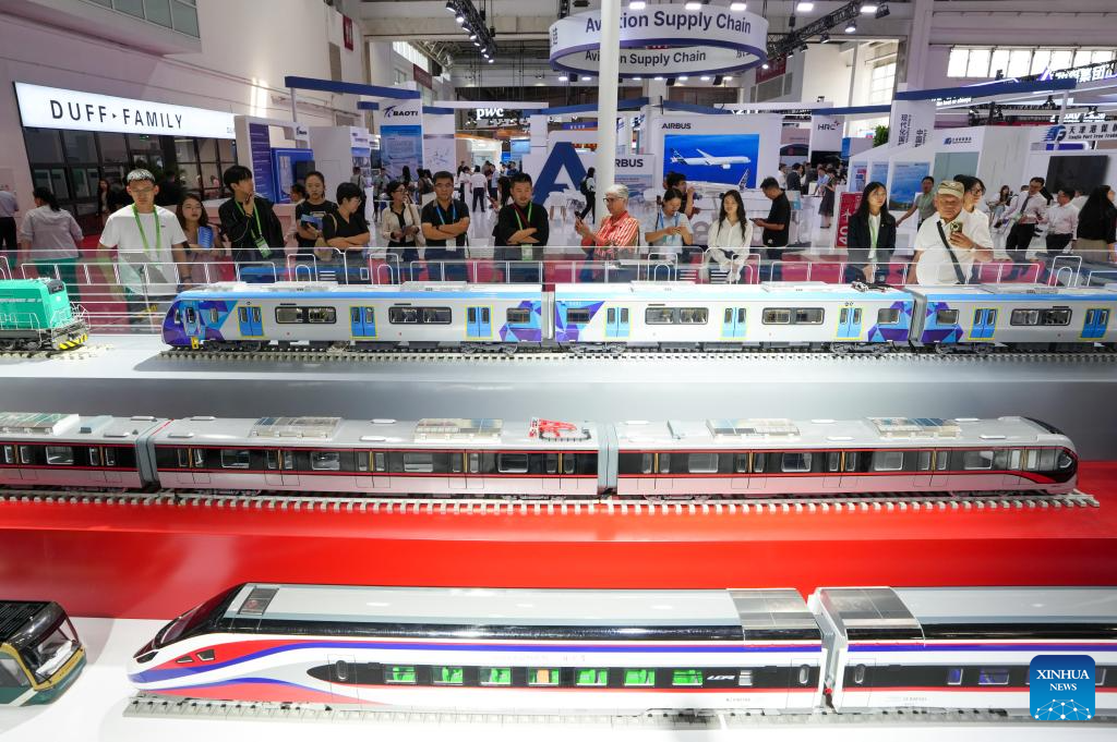 Visitors look at train models at the booth of CRRC in the Advanced Manufacturing Chain area of the third China International Supply Chain Expo (CISCE) in Beijing, capital of China, July 16, 2025. Held from July 16 to 20, the 2025 CISCE kicked off in Beijing on Wednesday. A key innovation for this edition is the “Debut Zone,” dedicated to the global premieres of new products, technologies, and ecosystems, showcasing breakthrough innovations that drive industrial collaboration. (Xinhua/Ju Huanzong)