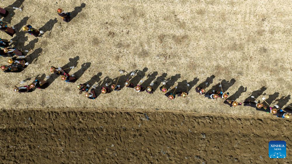 Villagers, dressed in traditional attires, participate in a ceremony marking the start of spring farming in Gaiba Village of Shannan City, southwest China’s Xizang Autonomous Region, March 16, 2026. Ceremonies marking the start of spring farming were held across Xizang on Monday. The ceremony holds great significance as it marks the beginning of a new year’s farming season and serves as a prayer for favorable weather and bountiful harvests. It is considered an important ritual in the farming regions of Xizang. Over 200 villagers, dressed in traditional attires, participated in the ceremony held in Gaiba Village of Shannan. (Xinhua/Jigme Dorje)