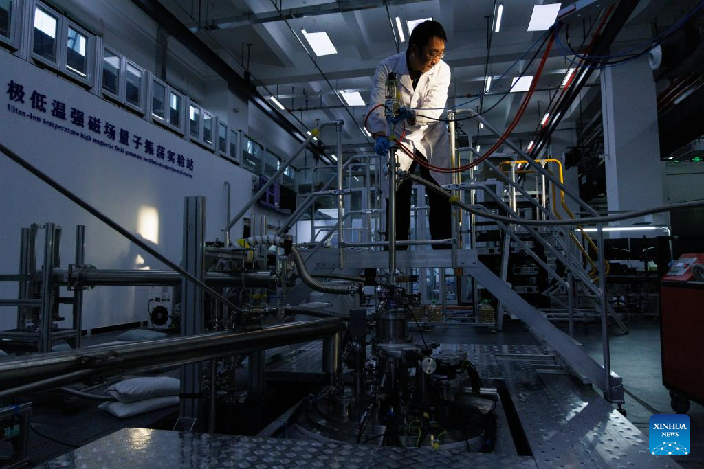 A researcher works at the ultra-low temperature high magnetic field quantum oscillation experimental station of the Institute of Physics of the Chinese Academy of Sciences in Beijing, capital of China, on Jan. 26, 2026. China has achieved a 35.6 tesla all-superconducting magnet in an experiment facility, setting a new record, the Chinese Academy of Sciences (CAS) said on Tuesday.