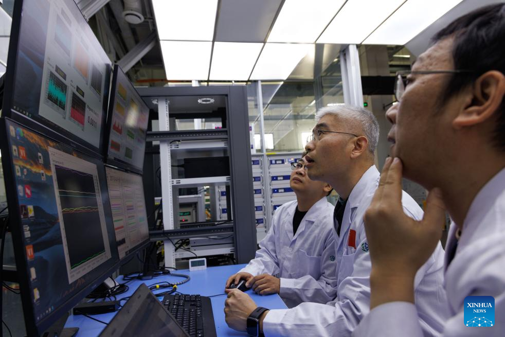 Researchers Li Gang, Liu Jianghua, and Zhou Benzhe (R-L) discuss the operational status of the all-superconducting magnet at the ultra-low temperature high magnetic field quantum oscillation experimental station of the Institute of Physics of the Chinese Academy of Sciences in Beijing, capital of China, on Jan. 26, 2026. China has achieved a 35.6 tesla all-superconducting magnet in an experiment facility, setting a new record, the Chinese Academy of Sciences (CAS) said on Tuesday.