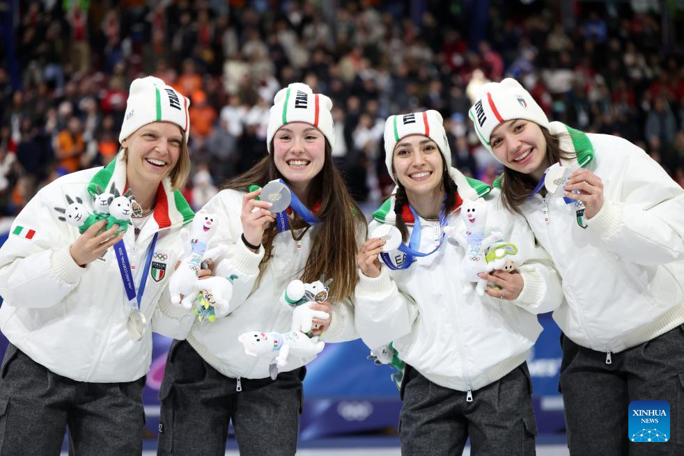 Silver medalists players of Italy pose for photos with the medals after the awarding ceremony for the short track speed skating women’s 3000m relay final A at the Milan-Cortina 2026 Olympic Winter Games in Milan, Italy, Feb. 18, 2026. (Xinhua/Li Ming)