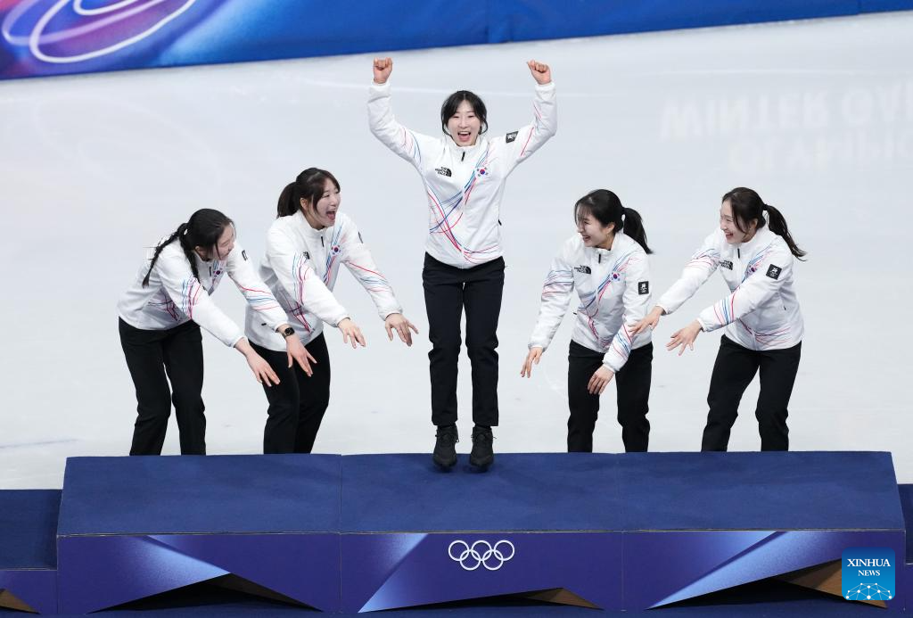 Gold medalists players of South Korea celebrate during the awarding ceremony for the short track speed skating women’s 3000m relay final A at the Milan-Cortina 2026 Olympic Winter Games in Milan, Italy, Feb. 18, 2026. (Xinhua/Xue Yuge)