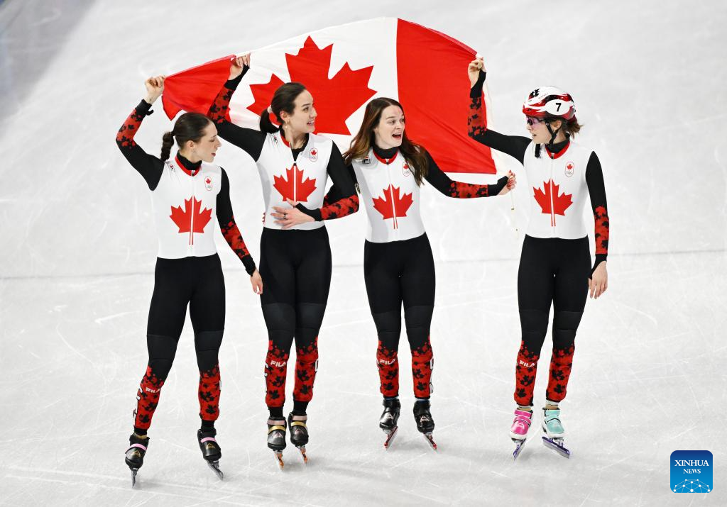 Players of Canada celebrate after the short track speed skating women’s 3000m relay final A at the Milan-Cortina 2026 Olympic Winter Games in Milan, Italy, Feb. 18, 2026. (Xinhua/Cheng Min)