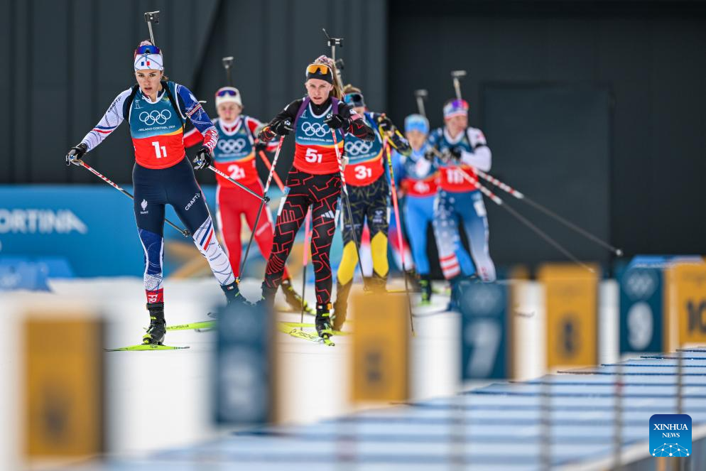 Camille Bened (1st L) of France competes during the biathlon women’s 4x6km relay at the 2026 Milan-Cortina Winter Olympics in Anterselva, Italy, Feb. 18, 2026. (Xinhua/Jiang Han)