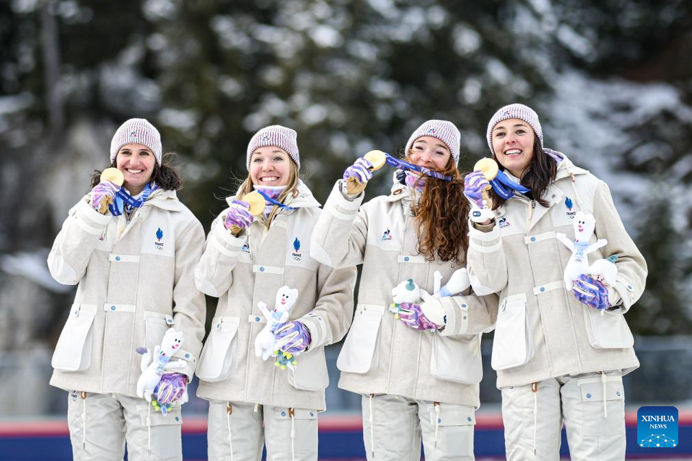 Gold medalists of France pose for photos during the awarding ceremony of the biathlon women’s 4x6km relay at the 2026 Milan-Cortina Winter Olympics in Anterselva, Italy, Feb. 18, 2026. (Xinhua/Jiang Han)