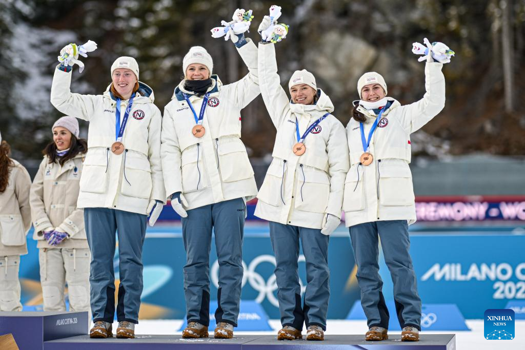 Bronze medalists of Norway pose for photos during the awarding ceremony of the biathlon women’s 4x6km relay at the 2026 Milan-Cortina Winter Olympics in Anterselva, Italy, Feb. 18, 2026. (Xinhua/Jiang Han)