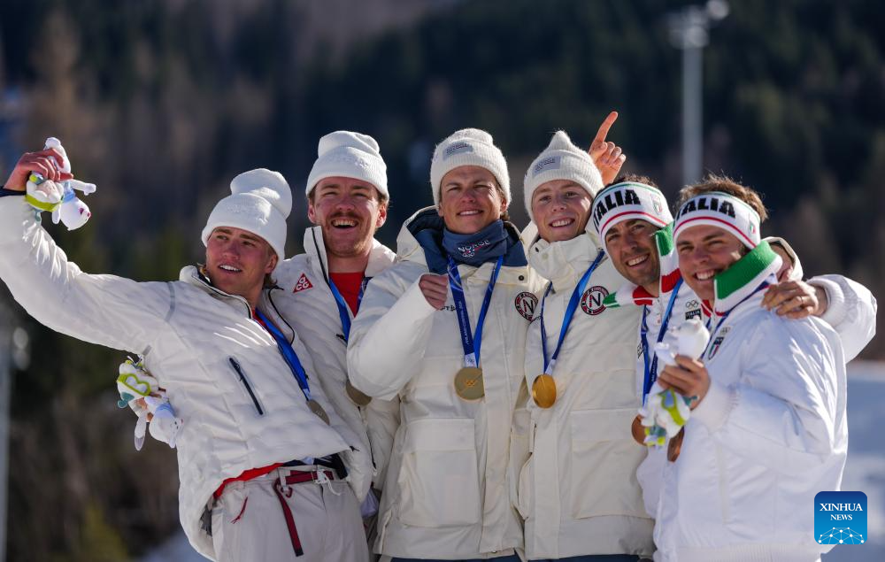 Gold medalists Einar Hedegart and Johannes Hoesflot Klaebo of Norway, silver medalists Ben Ogden and Gus Schumacher of the United States and bronze medalists Elia Barp and Federico Pellegrino of Italy pose during the awarding ceremony for the cross-country skiing men’s team sprint free at the Milan-Cortina 2026 Olympic Winter Games in Tesero, Italy, Feb. 18, 2026. (Xinhua/Peng Ziyang)
